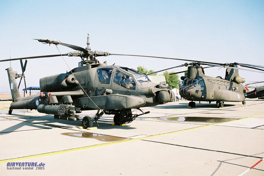 Typ AH-64 Apache zusammen mit einem Transporthubschrauber vom Typ Boeing Vertol CH-47 D