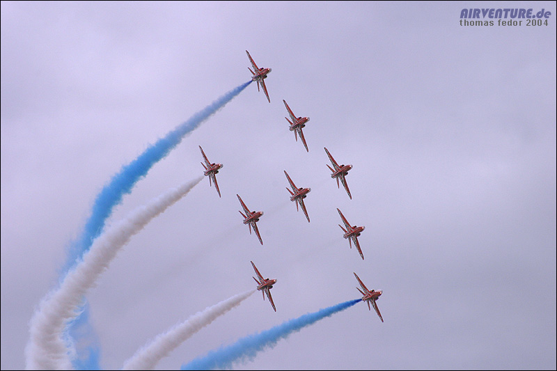 Die Red Arrows durften natürlich nicht fehlen. Sie hatten 1965 in Biggin Hill ihre erste Vorführung in England. Damals schon flog Ray Hanna als Nummer 3 mit. Mittlerweile geht die Formation in das 40. Jahr. Aufgrund des Wetters gab es nur ein eingeschränktes Display.