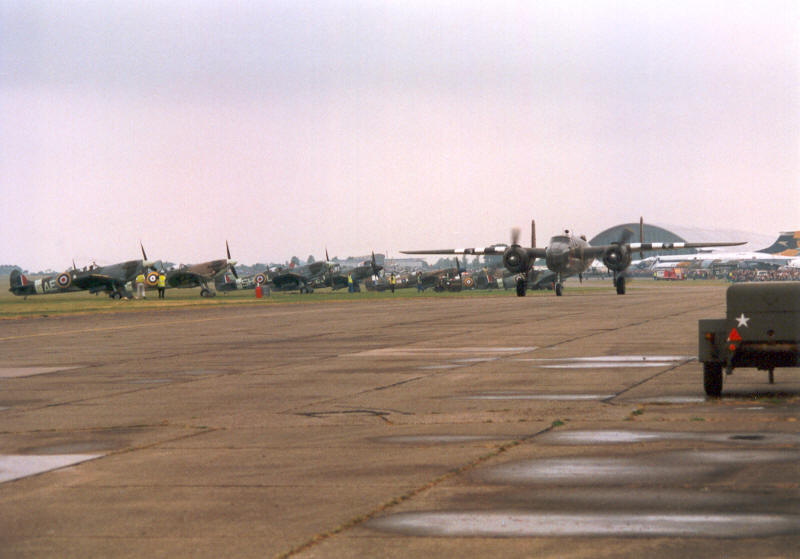 Apron Bei der Flying Legends Air Show 2001 war die Supermarine Spitfire das am stärksten vertretene Flugzeugmuster . Hier rollt eine B-25 Mitchell an den geparkten Spitfires vorbei.