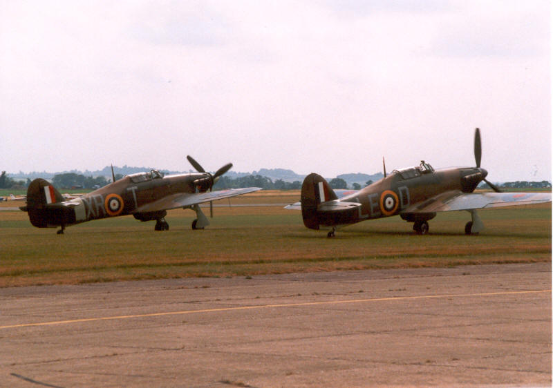 Hurricane Die Hawker Hurricane ist bei weitem nicht so berühmt wie die Spitfire und es gibt auch bei weitem nicht mehr so viele heute noch erhaltene Hurricanes wie Spitfires. Doch dieser Unterschied im Bekanntheitsgrad ist etwas ungerecht, denn in der Luftschlacht um England, während der die Spitfire so berühmt wurde, waren erstaunlicherweise über 60 % der Royal Air Force Jagdstaffeln mit der Hawker Hurricane ausgerüstet. Zwei Hurricanes konnte man bei der Flying Legends Air Show in Duxford 2001 im Flug bewundern. Hier stehen sie gerade in Startbereitschaft!
