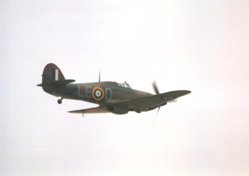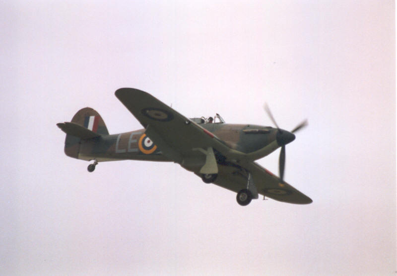 Diese Hawker Hurricane mit dem Kennzeichen "LE   D" trägt den Anstrich einer Maschine vom Typ Hurricane, die ein berühmter britischer Jagdflieger im Zweiten Weltkrieg geflogen hat: Douglas Bader. Sir Douglas Bader erreichte im Krieg 23 Luftsiege, aber er war nicht nur als erfolgreicher Jagdflieger berühmt. Durch einen Unfall hatte er Anfang der 30er Jahre beide Beine verloren. Da er leidenschaftlicher Flieger war wollte er unbedingt im aktiven Dienst bei der Royal Air Force bleiben und hat dies auch geschafft. Er lernte es mit zwei Beinprothesen zu fliegen. Duxford ist für eine Warbird Airshow übrigens auch vom historischen Standpunkt her gesehen ein idealer Ort, denn der Flugplatz Duxford war im Zweiten Weltkireg tatsächlich ein Royal Air Force Fliegerhorst! Die von Douglas Bader befehligte 242 Squadron war während der Luftschlacht um England zeitweise auch von Duxford aus im Einsatz!