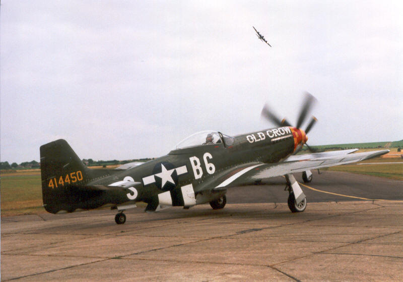 Und die Flugzeugtypen, die nicht ganz so selten sind, werden bei der Flying Legends Air Show in Duxford regelmäßig in großer Zahl vorgeflogen. So waren diesmal insgesamt vier North American P-51 D Mustang im Flug zu bewundern. Diese Mustang hier gehört der Scandinavian Historic Flight (www.shf.as). Das Flugzeug hat den Anstrich mit der Noseart "Old Crow" des berühmten amerikanischen Jagdfliegers Clarence E. 'Bud' Anderson von der 8. U.S. Air Force, 357th Fighter Group, 363rd Fighter Squadron.  Zur Zeit trägt diese Mustang den älteren olivgrünen Anstrich, der später im Krieg in den wesentlich bekannteren silberfarbenen Metallanstrich umgeändert wurde (die Scandinavian Historic Flight Mustang hatte früher auch diesen silbernen Anstrich und ist damit in unserer Noseartgalerie zu bewundern). Der inzwischen 79 Jahre alte Colonel Bud Anderson hat übrigens in diesem Jahr auch persönlich die Flying Legends Air Show besucht. In Duxford war er nur Zuschauer, aber in den USA fliegt er immer noch aktiv auf Airshows eine Mustang, die ebenfalls seinen persönlichen "Old Crow" Anstrich trägt!