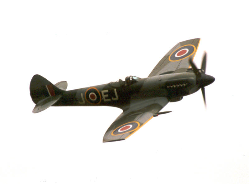 Diese Supermarine Spitfire Mk XIV gehört zur eindrucksvollen Flugzeugflotte der Fighter Collection. Eigentlich wird diese Maschine mit einem silbernen Anstrich geflogen. Den jetzt verwendeten dunklen Anstrich und die Kennungen "J   EJ" sowie "MV 268" bekam diese Spitfire im Jahre 2000 aus einem ganz besonderen Grund. Denn dies waren die Farbe und die Kennzeichen einer Spitfire, die von Johnnie Johnson geflogen wurde, mit 38 Luftsiegen der zweiterfolgreichste britische Jagdflieger des Zweiten Weltkriegs. Johnnie Johnson war bei der Flying Legends Air Show 2000 als Ehrengast persönlich anwesend und die Umspritzung dieser Fighter Collection Spitfire in die Farben der zuletzt von ihm geflogenen Spitfire - Einsatzmaschine war eine freudige Überraschung für ihn!