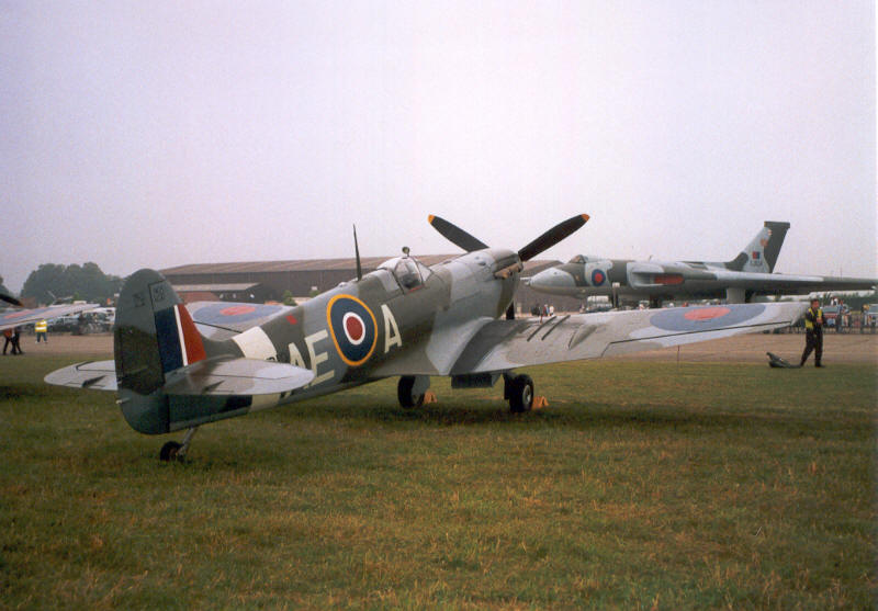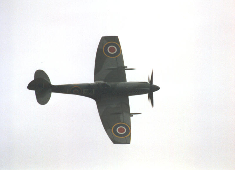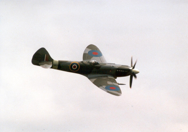 Auch diese Spitfire gehört der Fighter Collection in Duxford. Es handelt sich um eine Supermarine Spitfire Mk V. Die Flugzeuge der Fighter Collection werden oft für Spielfilmproduktionen gechartert. So war diese Spitfire hier in dem brandaktuellen Hollywoodfilm "Pearl Harbor" in den Szenen zu sehen, die während der Luftschlacht um England spielen. In dem Film war das Flugzeug mit den Kennzeichen "RF   M" versehen.