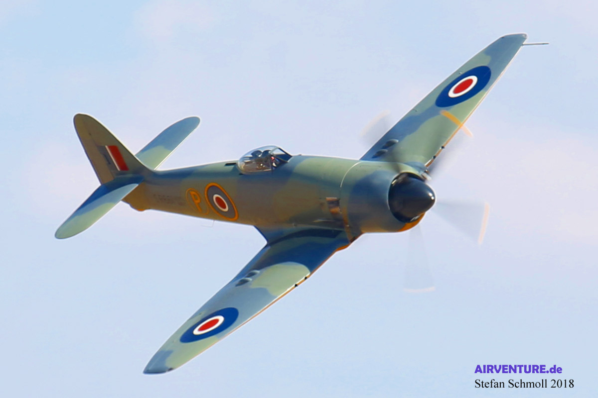 Während der Show war die Sea-Fury T.20 WG655 noch als G-CHFP auf die Fighter Collection zugelassen. Ende Juni wurde Shaun Patrick (ebenso Eigner der P-51 "The Shark") ihr neuer Besitzer und die Registrierung wechselte zu G-IVNN. Ausgerüstet ist sie mit einem 2.800 PS starken P&W R2800 Sternmotor. |