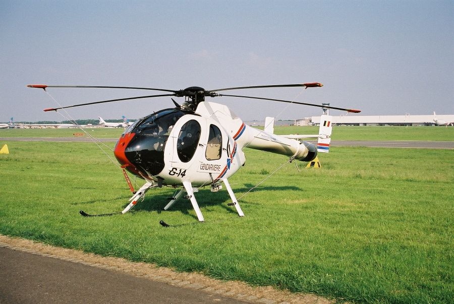 this police-helicopter type McDonnell Douglas MD 520 N is labeled in both languages: