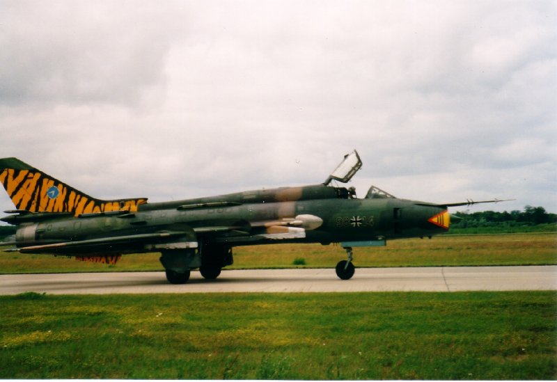 Im Flugprogramm waren nur Luftfahrzeuge der Bw vertreten. Ausländische Teilnehmer durften ihr Können im Fluge nicht zeigen. Ein Highlight neben der Vorführung der MiG-29 hatte das Flugprogramm sicherlich und zwar ein Flying Display einer SU-22 der WTD61. Dieses war auch eine der letzten öffentlichen Flugvorführungen der SU-22 der Bw überhaupt. Interessant ist das deshalb, da zu NVA-Zeiten zwei Geschwader (JBG-77 und MFG-28) mit SU-22 hier in Laage stationiert waren. Während am Freitag nachmittag, beim Training der Vorführungen, noch ordentliches Wetter herrschte, so war es am Samstag leider denkbar schlecht. Tiefhängende Wolken und ständiger Regen machten fast alles zunichte. Aber nur fast, denn geflogen wurde trotzdem und ich kann mich nicht erinnern, daß jemals bei so schlechtem Wetter Flugvorführungen gemacht wurden (Ablösungserscheinungen ohne Ende). Leider hat das Wetter das Fotografieren ziemlich schwer gemacht. Die hier gezeigten Bilder stammen auch ausnahmslos vom Fly-In und Fly-Out. Doch trotz tiefhängender Wolken und länger anhaltendem Regen wurden etwa 100.000 Besucher gezählt.