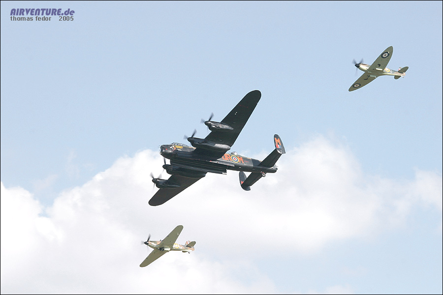 Formationsflug der Lancaster, Spitfire und Hurricane der Battle of Britain Memorial Fighter. In dieser Formation ging es am Sonntag nach London. Hier ist gerade der Bombenschacht der Lancaster geöffnet.