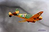 Warhawk im Überflug. Diese Curtiss P-40 ist lackiert in den Farben der "Flying Tigers". Markenzeichen der AVG (American Volunteer Group) war das Haifischmaul.