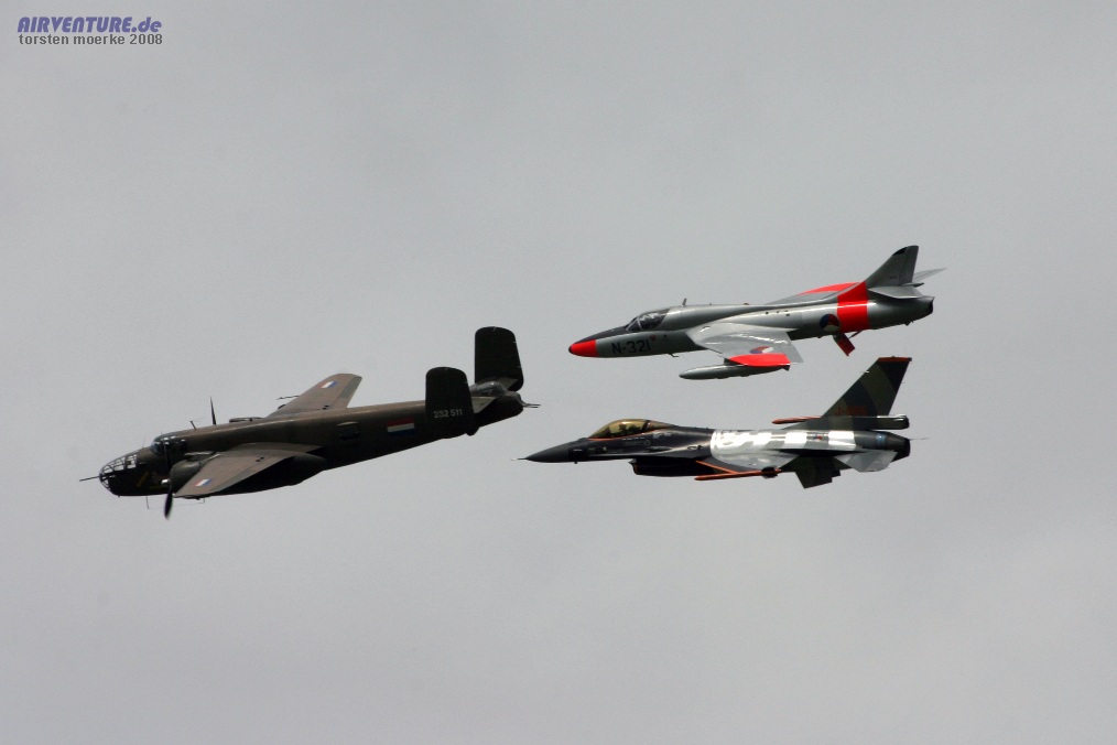Direkt vor seiner Solo Vorführung startete das F-16 Demoteam zu einem heritage-flight mit B-25 und Hawker Hunter. |