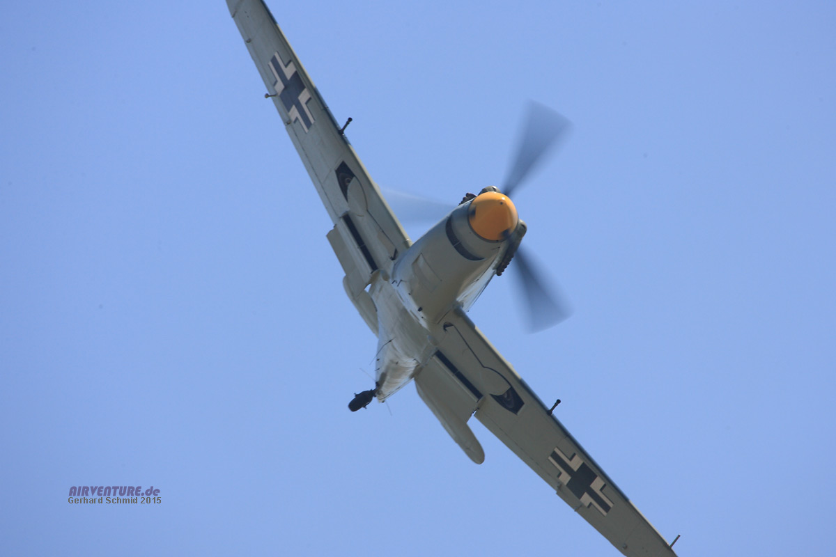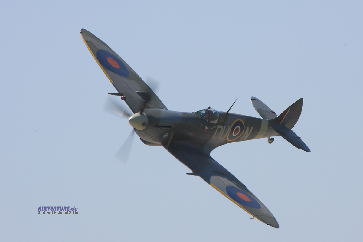 Die großen Gegner von einst... die schöne Spitfire LF.XVI war von Motorproblemen geplagt. Pilot Dan Griffith hat sich redlich um eine Fehlerbeseitigung bemüht, leider war bis zuletzt ein zuverlässiger Motorlauf nicht gewährleistet. |