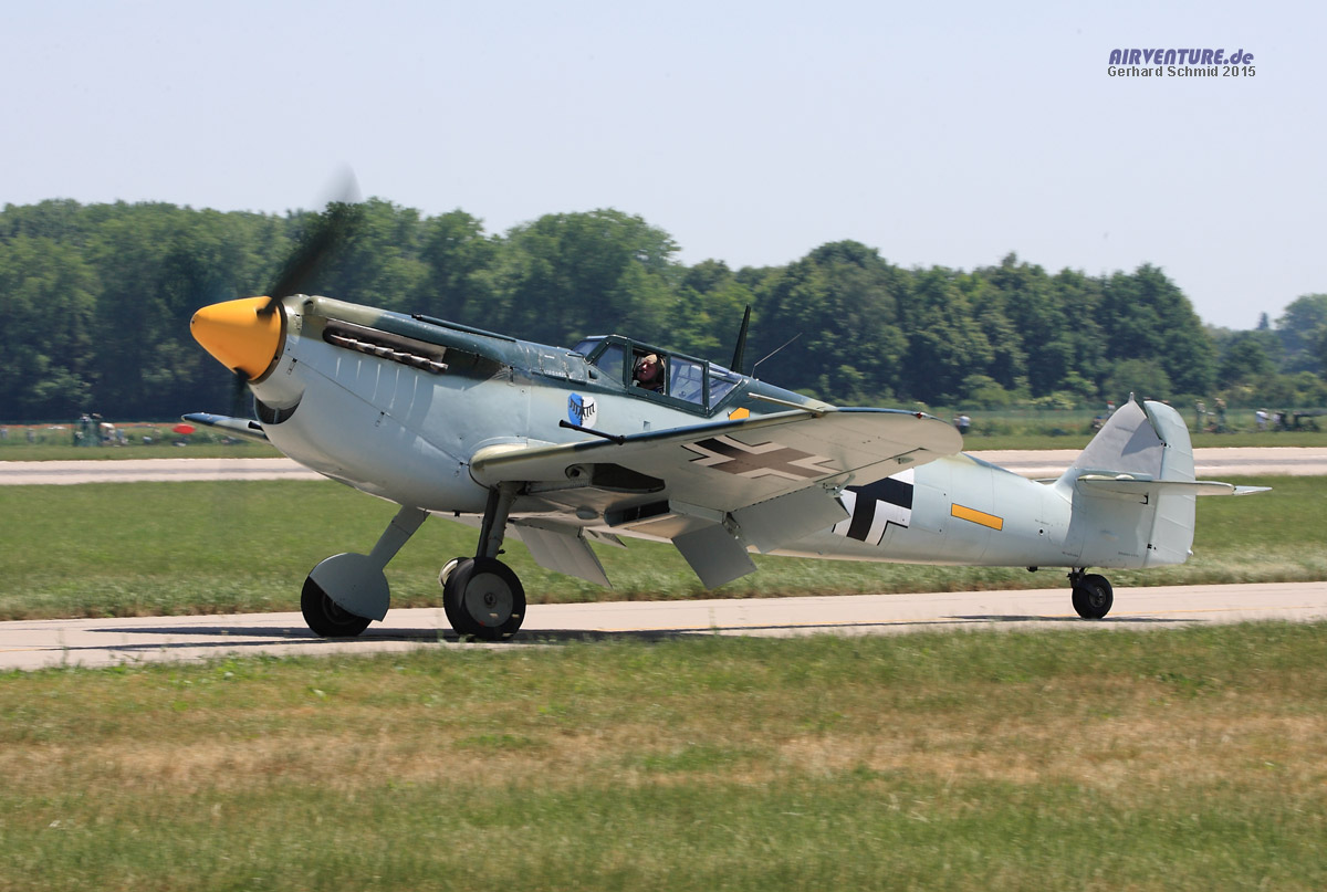 Kein echter Gegner von einst, aber wenigstens so ähnlich. Air Vice Marshal Cliff Spink brachte die Buchon über Deutschland nach Pardubice. Das erklärt, weshalb das Hakenkreuz am Seitenleitwerk lieblos grau übermalt war.