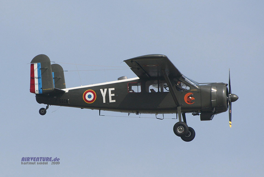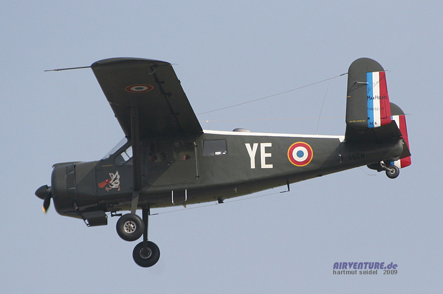 Im Rahmen des geschichtlichen Überblicks über die Entwicklung der Luftfahrt innerhalb der 100 Jahre seit der berühmten Flugwoche von Reims im Jahre 1909 war mit dieser Maschine vom Typ Max Holste Broussard im Flugprogramm des Meeting du Centenaire 2009 auch ein robustes französisches STOL-Mehrzweckflugzeug aus den fünfziger Jahren vertreten. |
