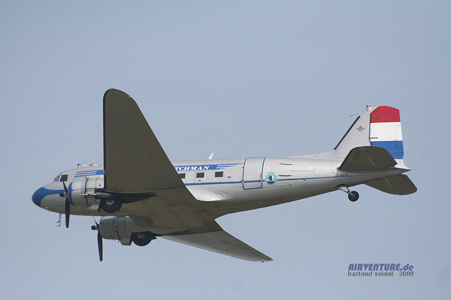 Die zivile Verkehrsluftfahrt der dreißiger und vierziger Jahre wurde im interessanten geschichtlichen Überblick des Meeting du Centenaire 2009 Flugprogramms mit dieser Douglas C-47 Dakota symbolisiert. |