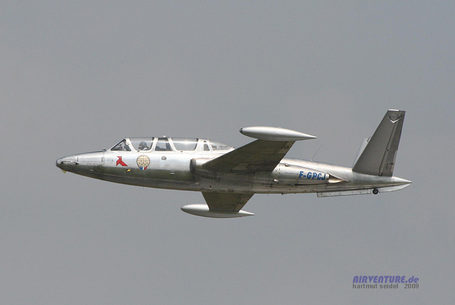 Der geschichtliche Überblick über die Entwicklung der Luftfahrt innerhalb der 100 Jahre seit der berühmten Flugwoche von Reims 1909 beinhaltete auch die Solo-Displays von zwei historischen Jets. Einer davon war dieser in den fünziger- und sechziger Jahren in großen Stückzahlen hergestellte Strahltrainer vom Typ Fouga Magister. |