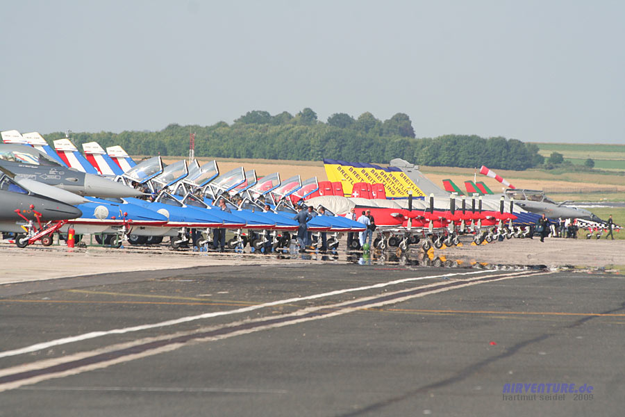 Das sich eine Vielzahl von Solo-Displays mit historischen Maschinen, wie zum Beispiel der Douglas C-47 Dakota, immer wieder mit einer großen Zahl von Einzel- und Formationsflugvorführungen mit modernen Flugzeugen, wie zum Beispiel den Extra 300 der Royal Jordanian Falcons abwechselten, machte einen besonderen Reiz des Flugprogramms des Meeting du Centenaire 2009 in Reims aus. |