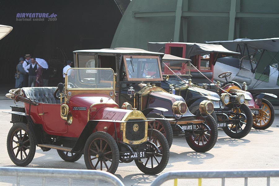 Um die Zuschauer ein wenig in die Zeit der auch als "Flugwoche von Reims" bekanntgewordenen Originalveranstaltung von 1909 zurück zu versetzen, sind am Abstellplatz der Morane-Saulnier Typ H und der Bleriot XI-2 auch einige Oldtimerfahrzeuge aus der Sammlung des Musée Automobile de Reims-Champagne ausgestellt worden. Links im Hintergrund des Fotos sind ausserdem Personen in historischer Kleidung der damaligen Zeit zu sehen. |