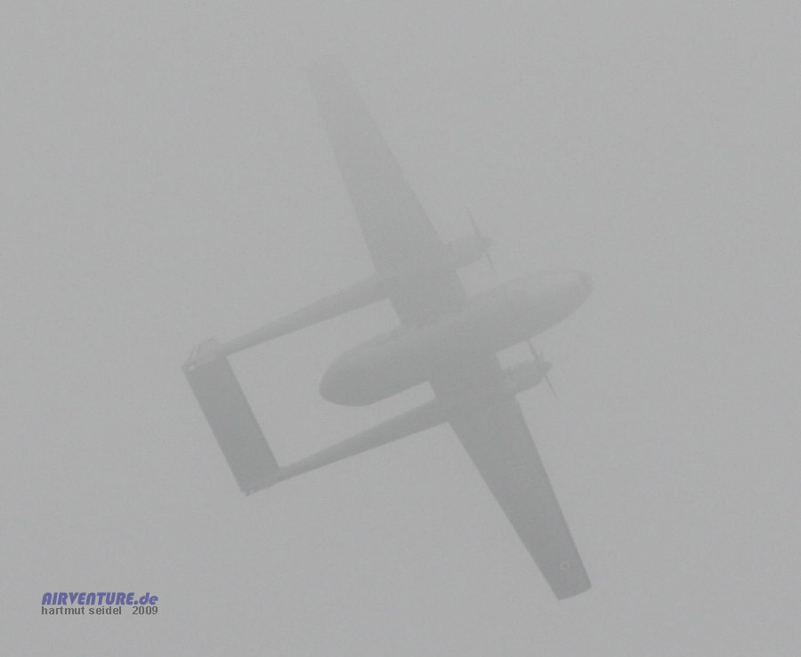 Am Samstag den 27. Juni war das Meeting du Centenaire 2009 anfangs noch mit sehr dunstigem Wetter konfrontiert, wie diese Aufnahme der Noratlas-Flugvorführung am Samstagmorgen um 10 Uhr zeigt. Da sich das Wetter am Samstag nur sehr langsam gebessert hat, machte dies leider wie schon mal erwähnt einige wetterbedingte Änderungen und Verschiebungen im Samstags-Flugprogramm notwendig. |