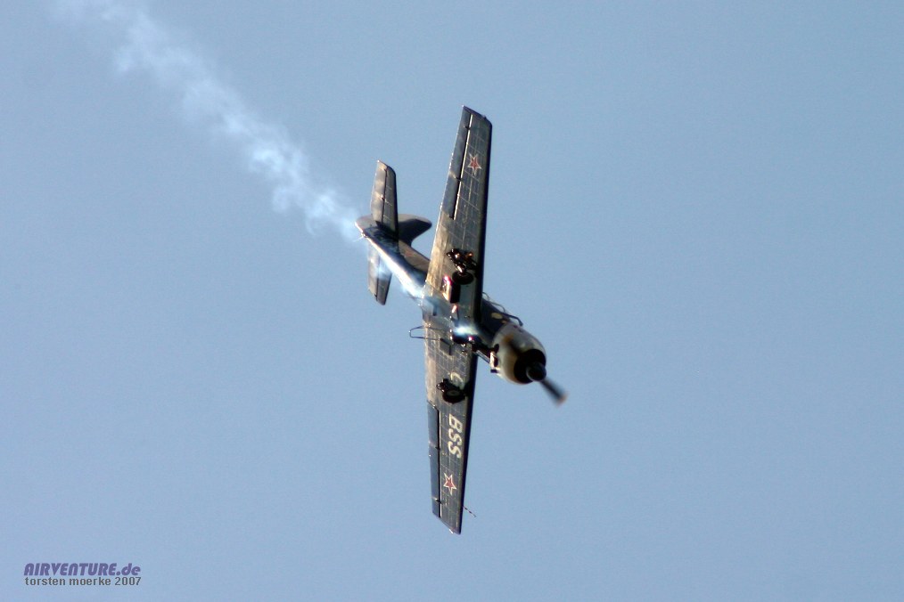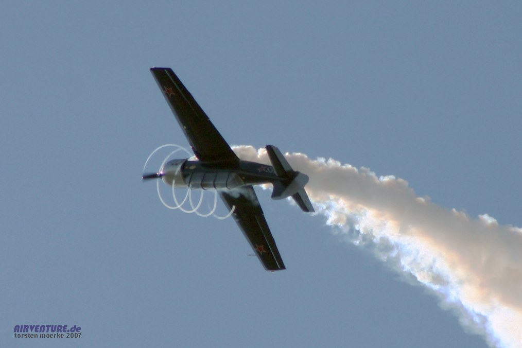 Eine Jak-52 im Looping... die seltene Propellerspirale entsteht, wenn feuchte