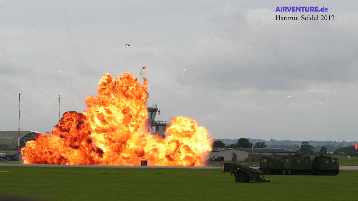 .....bei der - wie hier zu sehen ist - die Pyrotechniker am Boden auch wieder alle Hände voll zu tun gehabt haben, um die Bombenexplosionen und Raketeneinschläge des simulierten Angriffs der beiden Tornados richtig in Szene zu setzen. |