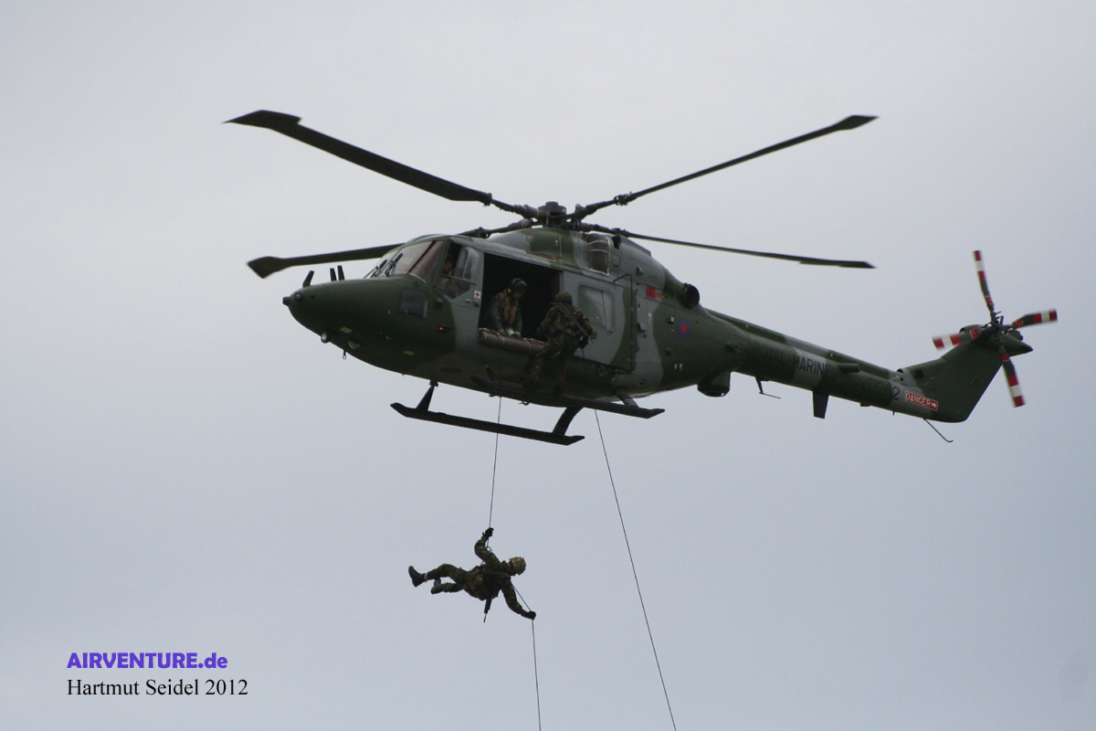Während der Luftlandedemonstration wurden verschiedene Absetzverfahren gezeigt. Hier seilen sich gerade Soldaten der Royal Marines aus einem Hubschrauber vom Typ Westland Lynx ab. |