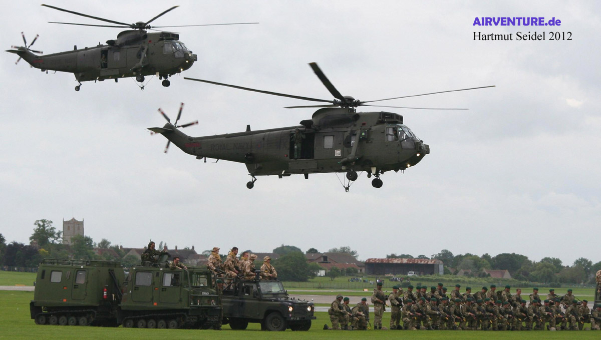 Den abschließenden Höhepunkt der Flugvorführungen beim RNAS Yeovilton International Air Day 2012 bildete wieder das traditionelle "Commando Assault Finale". Bei dieser großen Luftlande-Demonstration wurde das Absetzen einer Kompanie der "Royal Marines"-Infanterie samt Ausrüstung gezeigt. Da dies im Rahmen der Vorführung in einem Kampfgebiet unter dem Beschuss von feindlichen Bodentruppen geschehen sollte, erhielten die eigenen Kräfte Luftunterstützung durch zwei Maschinen vom Typ British Aerospace Hawk..... |