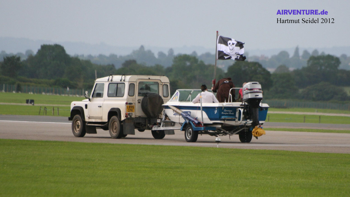 Das Szenario der Anti-Piraten-Einsatzdemonstration der Maritime Lynx Force war folgendes : Piraten im Indischen Ozean haben ein Schiff überfallen und dabei eine Geisel genommen. Anschließend ergreifen sie mit der Geisel die Flucht in einem Speedboat. Hierzu wurde während der Vorführung das auf einem Anhänger befestigte Boot von einem Land Rover über den Platz gezogen. Man beachte die am Speedboat befestigte Piratenflagge ! |