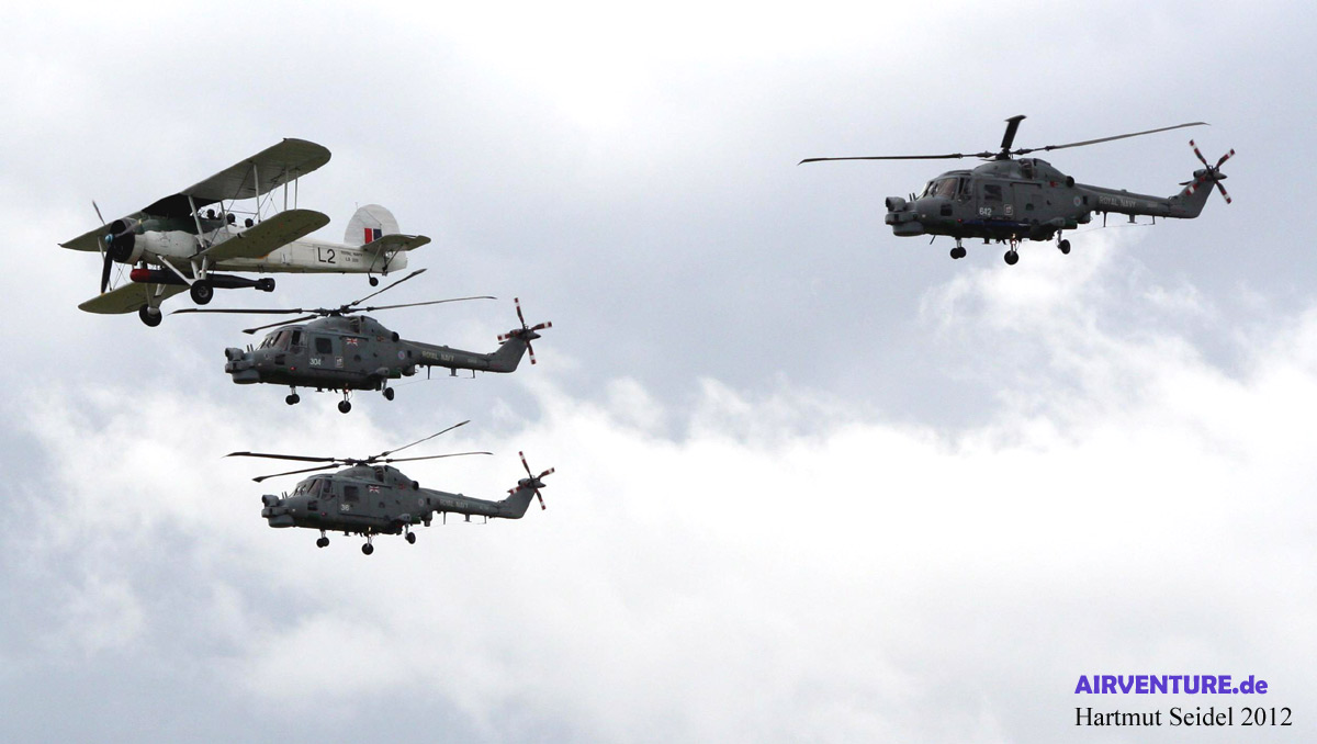 Vor dem Beginn der Einsatzdemonstration haben die Hubschrauber der Maritime Lynx Force zusammen mit einer Maschine vom Typ Fairey Swordfish der ebenfalls in Yeovilton beheimateten Royal Navy Historic Flight noch einen Formations-Vorbeiflug zum Thema "Naval Aviation Past and Present" durchgeführt. |