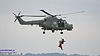 Zum Abschluss der Einsatzdemonstration der Maritime Lynx Force wurde noch die Rettung der im Wasser schwimmenden Geisel gezeigt. Zur Bergung der nunmehr befreiten Geisel hat sich ein Crewmitglied des Hubschraubers abseilen lassen und wird nunmehr zusammen mit der geretteten Geisel an der Seilwinde hochgezogen und an Bord genommen. |