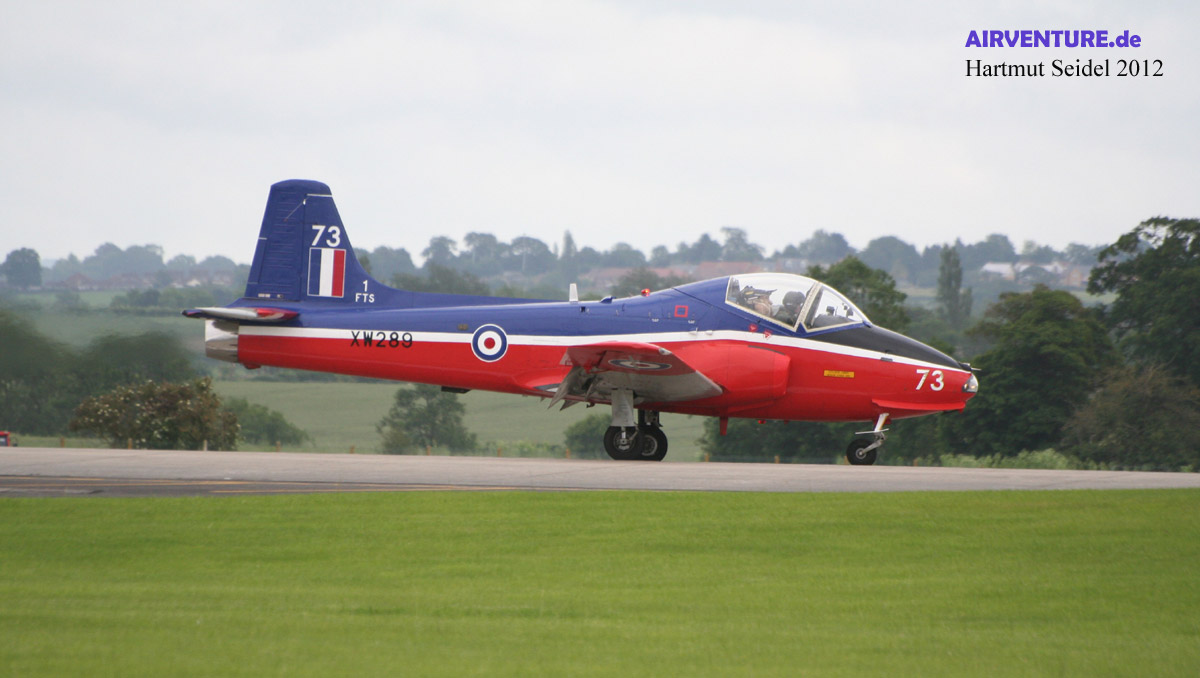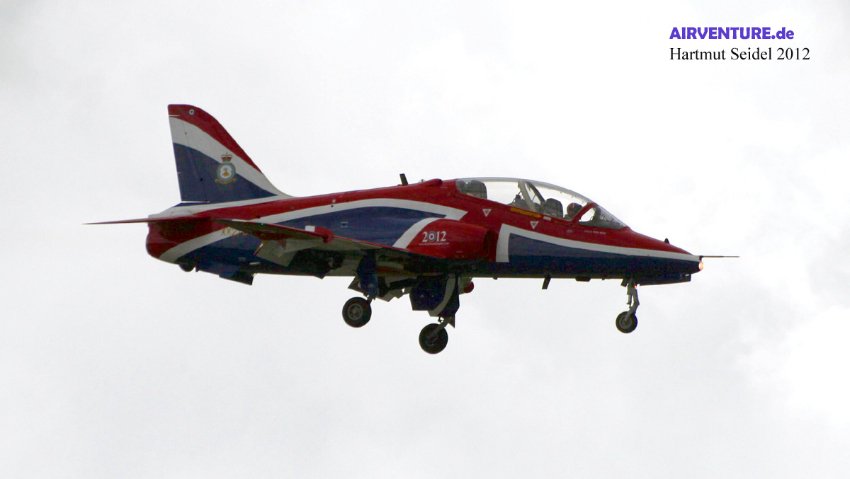Die RAF Solo-Vorführung mit dieser farbenfroh angestrichenen Hawk wurde während des RNAS Yeovilton International Air Day 2012 geflogen von Flight Lieutenant Philip Bird von der 208 Squadron der No 4 Flying Training School mit Heimatbasis auf dem Royal Air Force Fliegerhorst Valley, gelegen auf der zu Wales gehörenden Insel Anglesey. |
