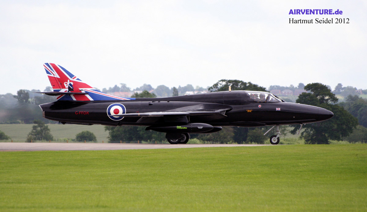 Mit dieser Maschine vom Typ Hawker Hunter T 7 A der Hunter Flight Academy wurde sogar noch ein fünfter britischer Jet-Klassiker im Flugprogramm des RNAS Yeovilton International Air Day 2012 gezeigt. |