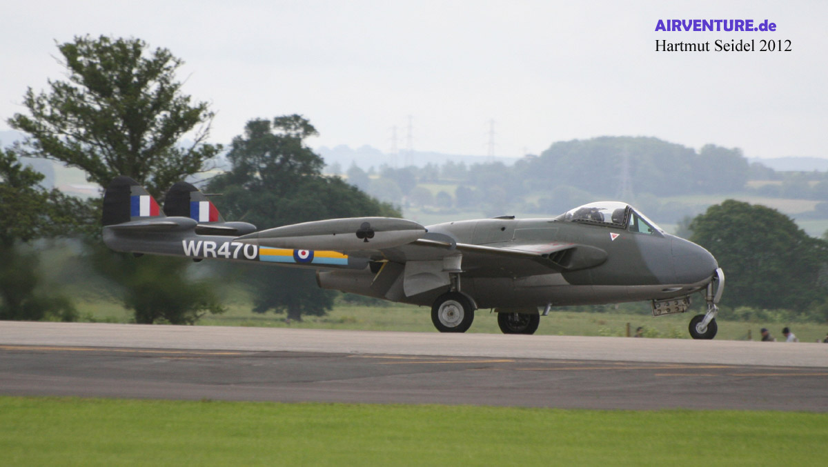 Die während des Yeovilton International Air Day 2012 im Flug gezeigte De Havilland Venom ist eine von insgesamt zwei Venoms des ( damals noch ) Classic Aircraft Trust. Beide Maschinen wurden in der Schweiz in Lizenz gebaut, wo Maschinen dieses Typs bis 1983 von der Schweizer Luftwaffe eingesetzt worden sind. |